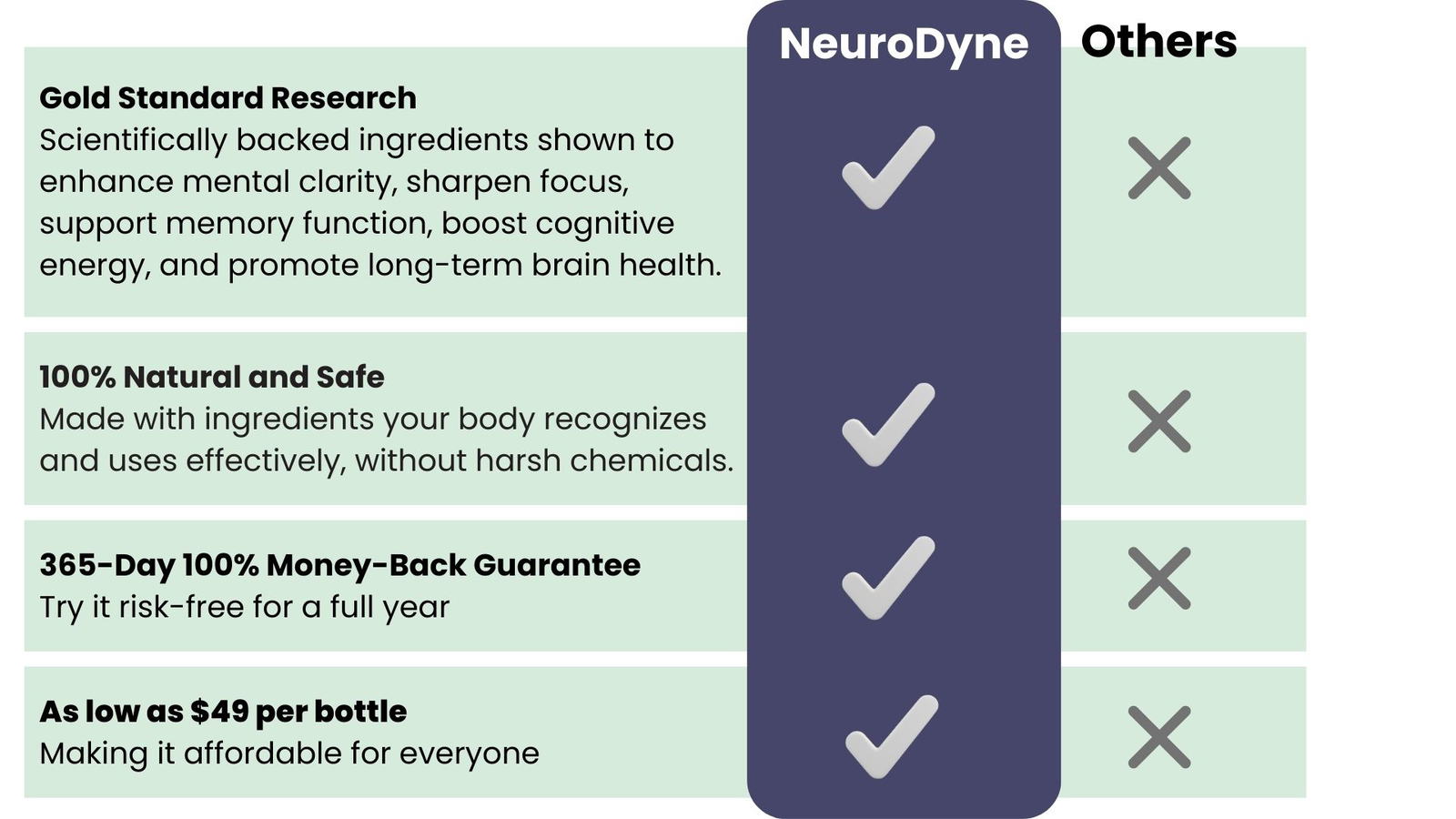 We’re so confident you’ll experience meaningful cognitive improvements that we back NeuroDyne with a 100% satisfaction guarantee for 365 days. Start taking it as soon as it arrives, and within days you may begin to notice improved mental clarity, calmer thought patterns, and sharper focus. As you continue your journey, you could experience gradual enhancements in memory, cognitive energy, and overall brain balance—making it the perfect time to track your progress. And if after several weeks or even months you’re not completely satisfied, simply request a full refund. With NeuroDyne, you stay fully in control of your cognitive health journey—completely risk-free.